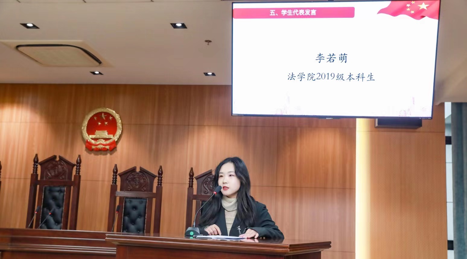 学生代表李若萌在闭幕式上发表感言,作为法科学生,因为懂得法律而变得理性和审慎,因为懂法更要不失温度和温情。在法治文化节中,通过各种锻炼和实践,同学们不但收获了实践能力的提升,更进一步厚植了法治理念和家国情怀。