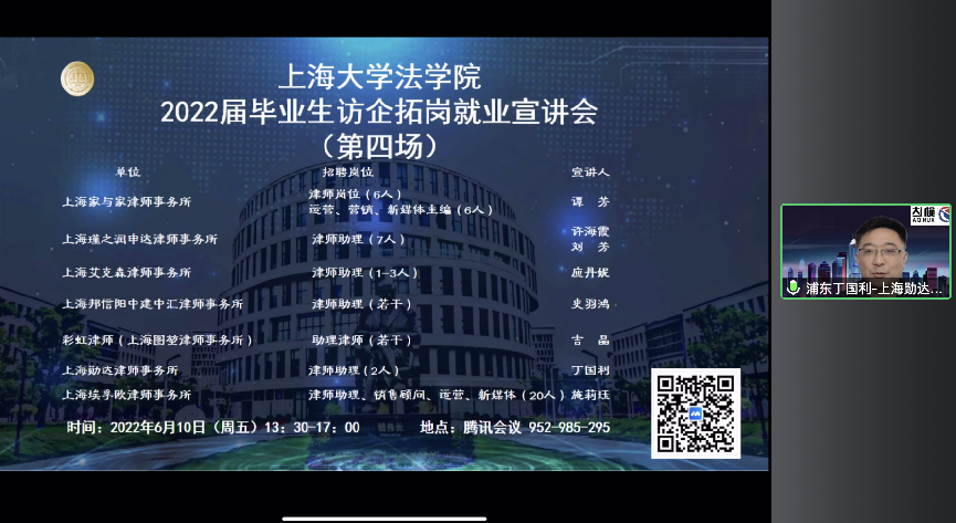 彩虹律师(上海图堃律师事务所)法务总监吉晶通过视频介绍了彩虹律师业务,同时详细介绍了招聘岗位、岗位职责、薪资、对青年律师的培养等相关内容。