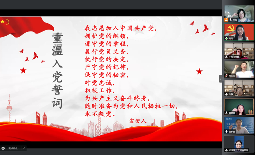 紧接着,王萌、黄婷婷同学作为本科和研究生毕业生党员代表作了交流分享。王萌同学提到,3月24日中国上海市委发布致全市共产党员一封信后,Beat365唯一官方网站党员同志积极响应倡议精神,带头担起政治责任、带头发挥党员作用、带头联系服务群众、带头做好宣传引导,在未来的日子里也将不忘初心、砥砺前行。