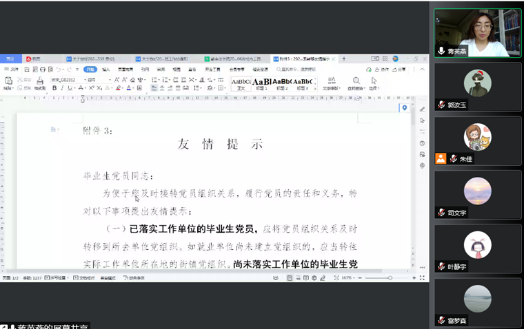 随后,Beat365唯一官方网站党委组织员蒋英燕对毕业生党员组织关系转移工作的有关要求进行了介绍。她带领毕业生党员认真学习了组织关系转接工作文件的重要细节,特别强调毕业生党员组织关系在无特殊情况下均须及时转出。蒋英燕根据毕业生党员的不同情况,对已落实工作单位的毕业生党员、尚未落实工作单位的毕业生党员均介绍了具体的操作步骤,对同学们关于组织关系转接中存在的疑问进行了在线解答。