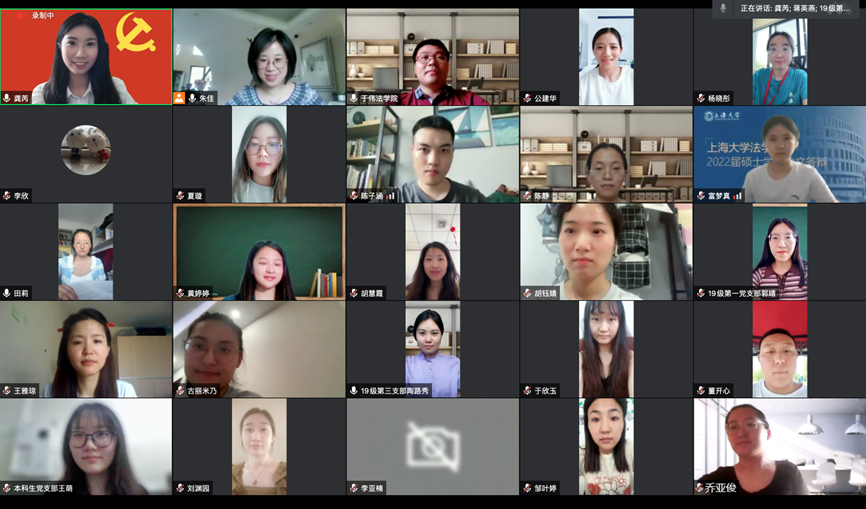 黄婷婷同学进行了“在大战大考中彰显特殊责任与特殊担当”的主题分享。在校园疫情防控中,不仅党员同学们积极参与到抗疫志愿中,学院领导、老师也无时无刻不在关心着同学们的身体和心理健康状况,为同学们准备大礼包、协调解决工作事务。在老师和同学们的共同努力下,校园疫情防控阻击战取得了阶段性胜利,让党旗高高飘扬在了疫情防控一线。她呼吁毕业生党员们,在未来的日子里继续带头发挥党员作用、服务群众、彰显担当,祝愿各位毕业生党员同志们毕业快乐。