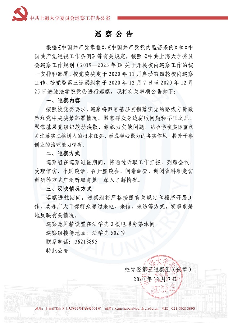 校党委第三巡察组结束巡察进驻工作公告