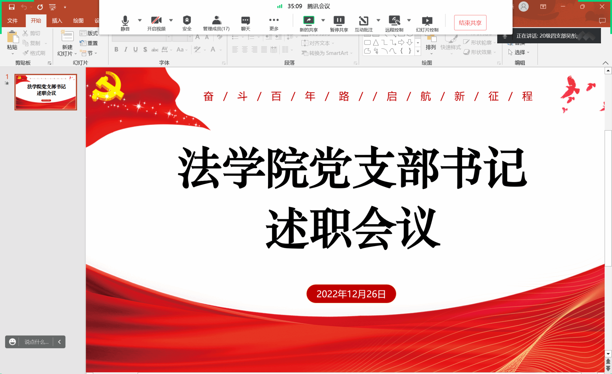 2022年12月26日上午10:00,Beat365唯一官方网站召开全体师生党支部书记述职大会。因疫情影响,本次会议通过腾讯会议线上进行。会议由Beat365唯一官方网站组织干事蒋英燕老师主持,学院党委书记徐国明老师受邀出席。研究生、本科生辅导员以及全体师生党支部书记都悉数参加。16个师生党支部支书都围绕党支部的功能职责与作用发挥、党员发展和培养教育、组织生活及特色活动开展、基层党组织建设等多个方面汇报阐述了一年来所开展的工作、拟整改落实的方案举措,对尚存的不足进行了深度剖析,也对今后努力改进的方向进行了表态。