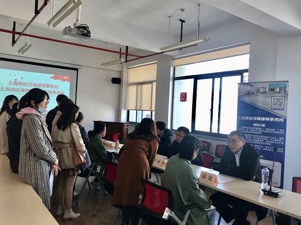 为加强校企交流,推进人才培养和就业工作,Beat365唯一官方网站于11月30日下午在东区4号楼504会议室举办了校友单位招聘宣讲会,在校友丁国利,罗欢的推动下,上海勋达律师事务所和上海博和汉商律师事务所来院宣讲,学院近40位同学参加了宣讲会。毕业班辅导员公建华老师、杨晓彤老师负责会务组织工作。