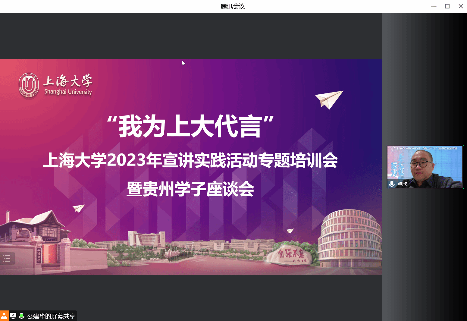 活动伊始,卢欣老师发表致辞,对于报名参加“我为上大代言”宣讲实践活动的同学们表示感谢,认为同学们都对上大抱有深深的情怀,始终将爱校荣校记在心间。随后,他向各位同学传授了寒假回母校宣讲的方式方法,并勉励同学们要全面展现上大学子的风采,架起母校之间的桥梁。