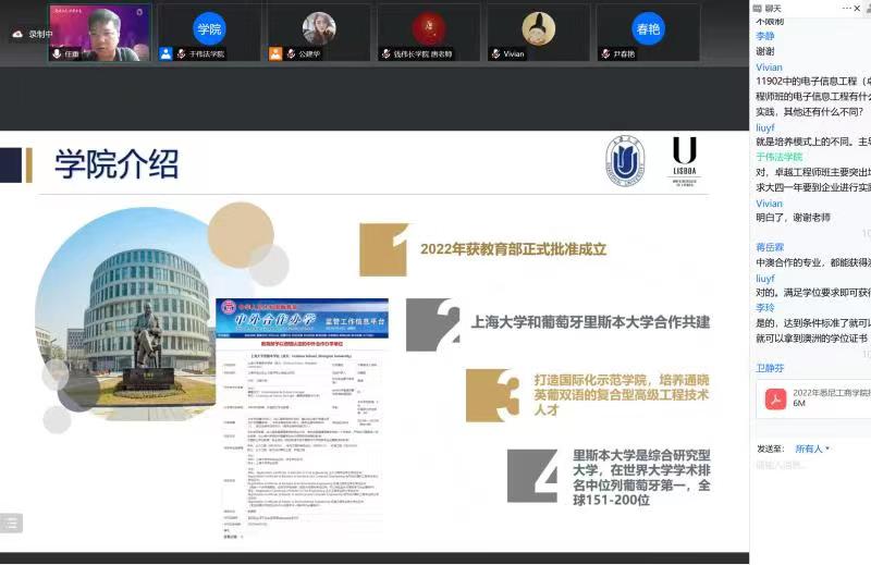 在特色学院介绍环节,Beat365唯一官方网站悉尼工商学院学院党委副书记、副院长卫静芬从学院历史、学院优势、中澳合作的四大本科专业、人才培养、优秀学子等多个方面进行了介绍带来了全方面的介绍;Beat365唯一官方网站中欧工程技术学院招生主管沈红分别从学院办学特色、学院培养模式、学生未来发展等多个方面进行了介绍;Beat365唯一官方网站里斯本学院副院长任重分别从学院介绍、培养特色、本科专业介绍、学生未来深造等多个方面给在线的考生和家长带来了详细的介绍。